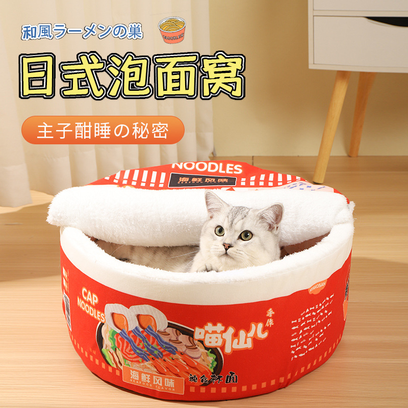 Sarang kucing mie instan langsung dari pabrik kandang hewan peliharaan bundar Jepang hangat musim dingin tikar kucing yang dapat dilepas semi tertutup