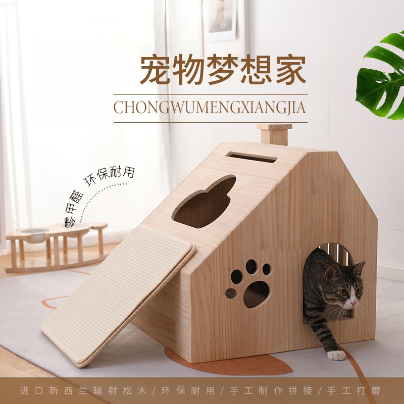 Grosir disesuaikan kayu padat sarang kucing lucu kucing Villa sarang kucing empat musim Universal sarang hewan peliharaan papan gores kucing rumah kucing