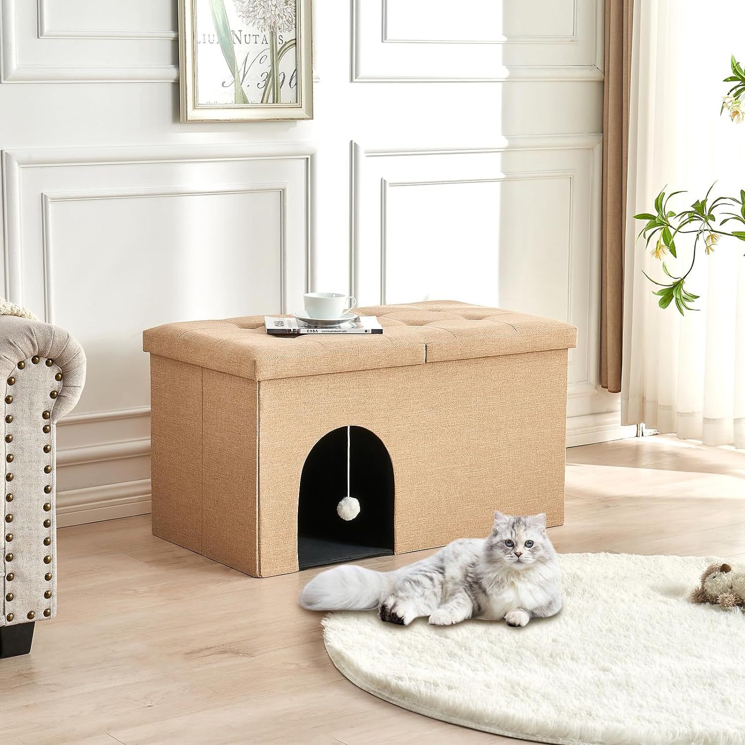 Bangku penyimpanan hewan peliharaan ukuran besar, kotak penyimpanan katun linen multifungsi hewan peliharaan ruang besar dapat dilipat rumah kucing