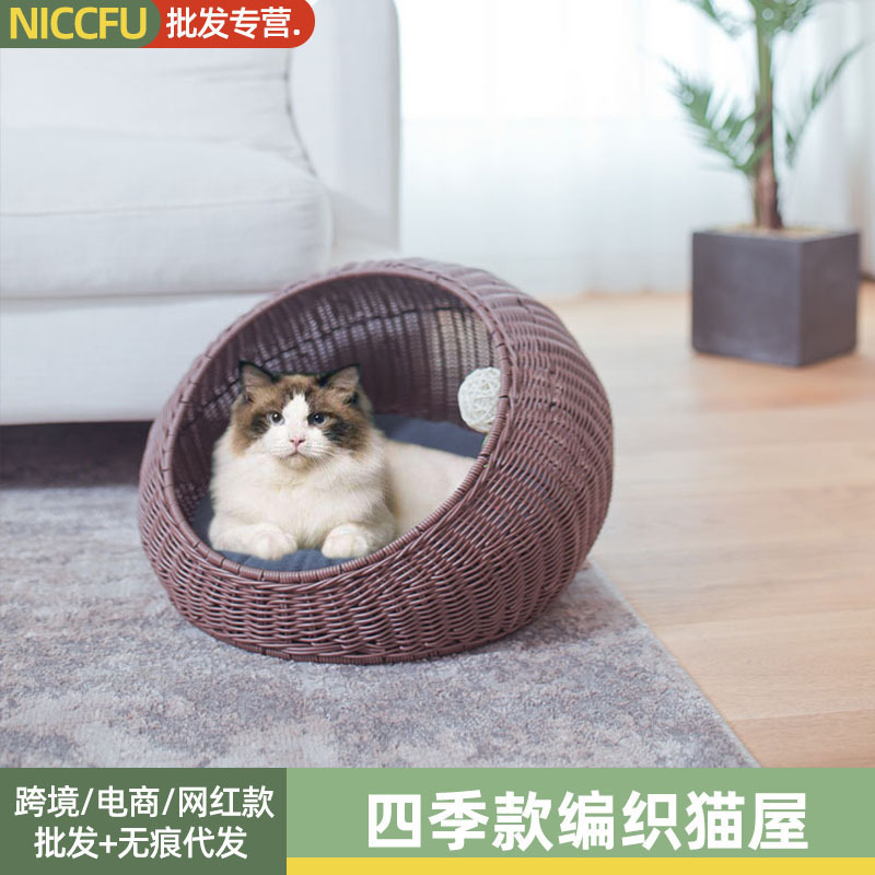Sarang kucing rotan buatan tangan tertutup empat musim, sarang anjing kecil hewan peliharaan Musim Panas tembus angin