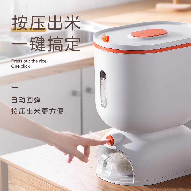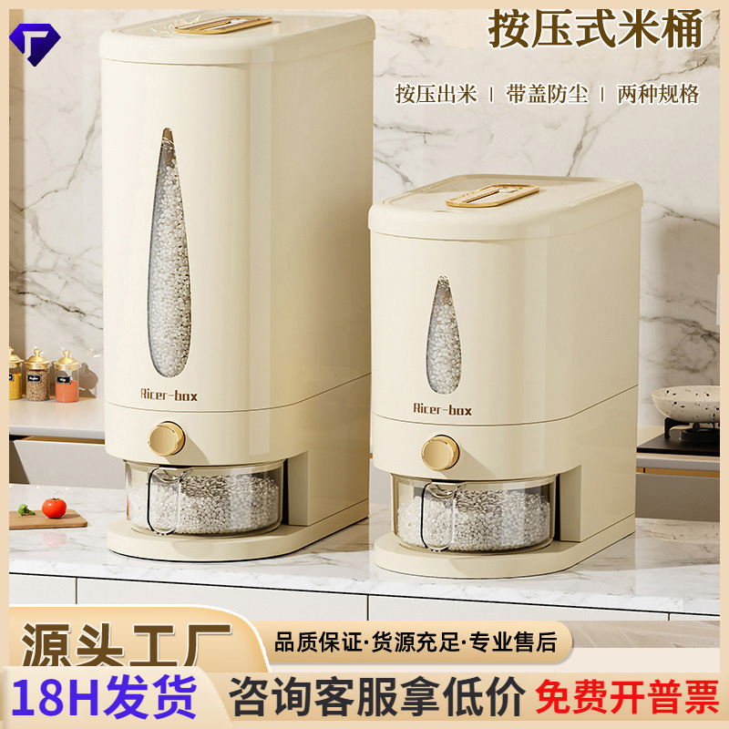 Ember beras tekan otomatis, kotak Beras pengukur biji-bijian beras plastik penyimpanan tertutup anti lembab tahan serangga rumah tangga