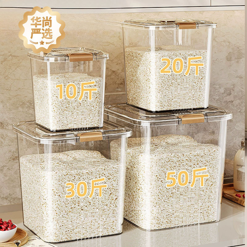 Ember beras plastik rumah tangga tertutup dapur, pot penyimpanan beras transparan 20kg, kotak penyimpanan biji-bijian tepung, tahan kelembapan, anti serangga