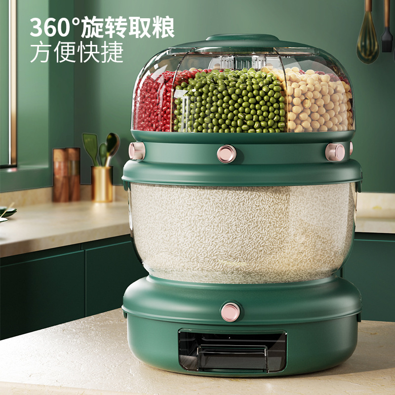 Kotak beras berputar mewah, multi-fungsional ringan rumah tangga lapisan ganda kompartemen penyimpanan nasi tahan kelembaban dapur satu klik kuantitatif ember beras