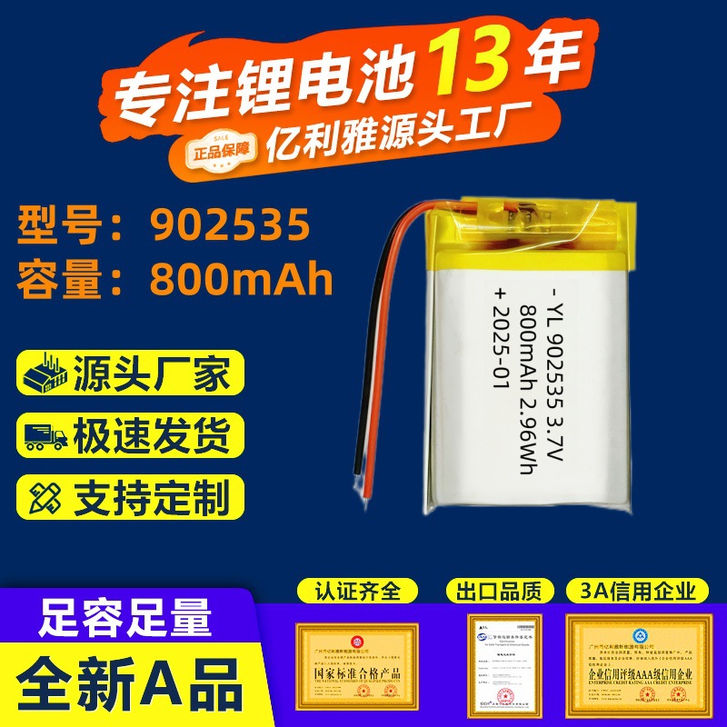 902535 Polimer Baterai Lithium 800mAh Bluetooth Headset Mainan Listrik Disinfektan Lampu Isi Ulang Baterai 3.7V