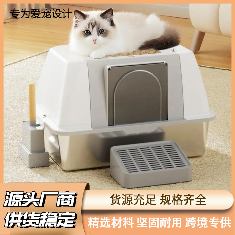 Perdagangan luar negeri lintas batas sepenuhnya tertutup stainless steel kotak kotoran kucing ukuran besar pasir anti percikan tinggi persediaan toilet kucing mudah dibersihkan