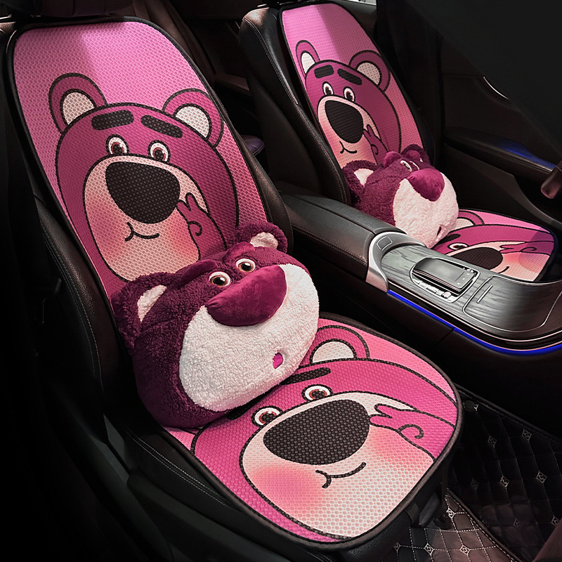 Bantal mobil Beruang stroberi empat musim, sarung kursi mobil penutup kursi kartun lucu ventilasi antilembap jaring universal