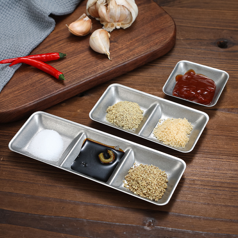 Retro hidangan rasa baja tahan karat gaya Jepang, dua kisi tiga kisi piring bumbu makanan ringan piring saus piring panas