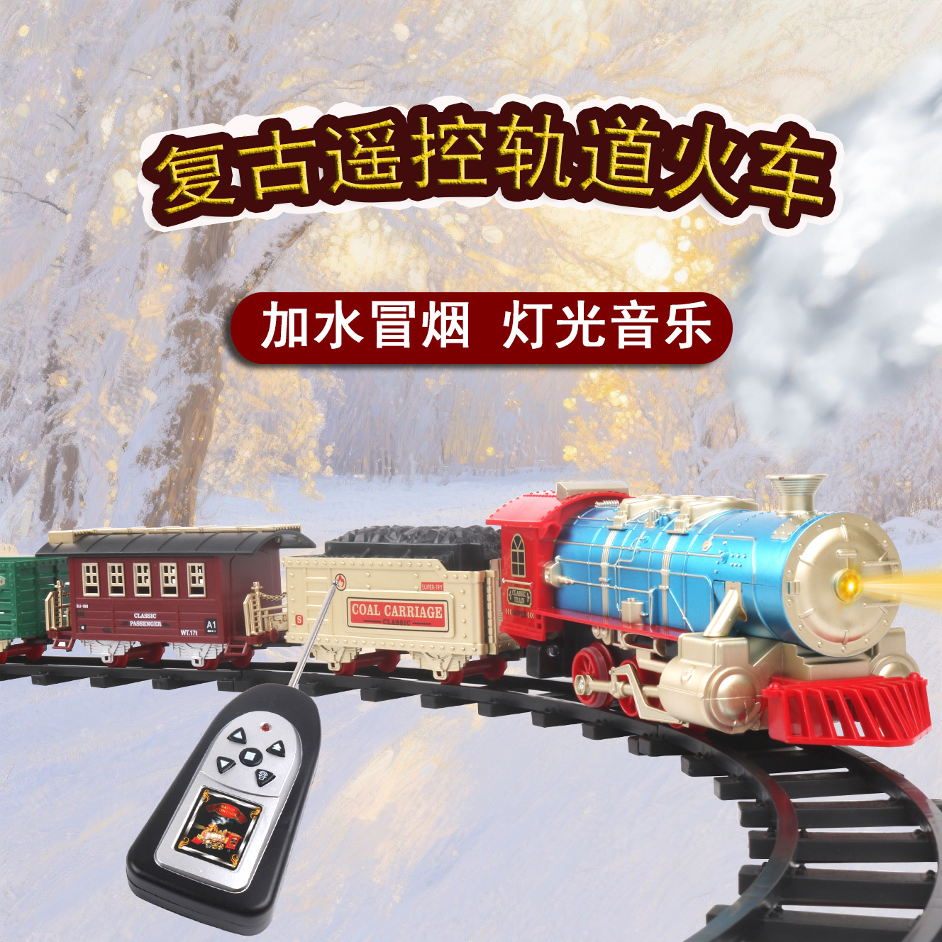 Lintas batas anak-anak remote control kereta api mainan asap lampu musik retro pengisian uap kereta Natal kecil perdagangan luar negeri
