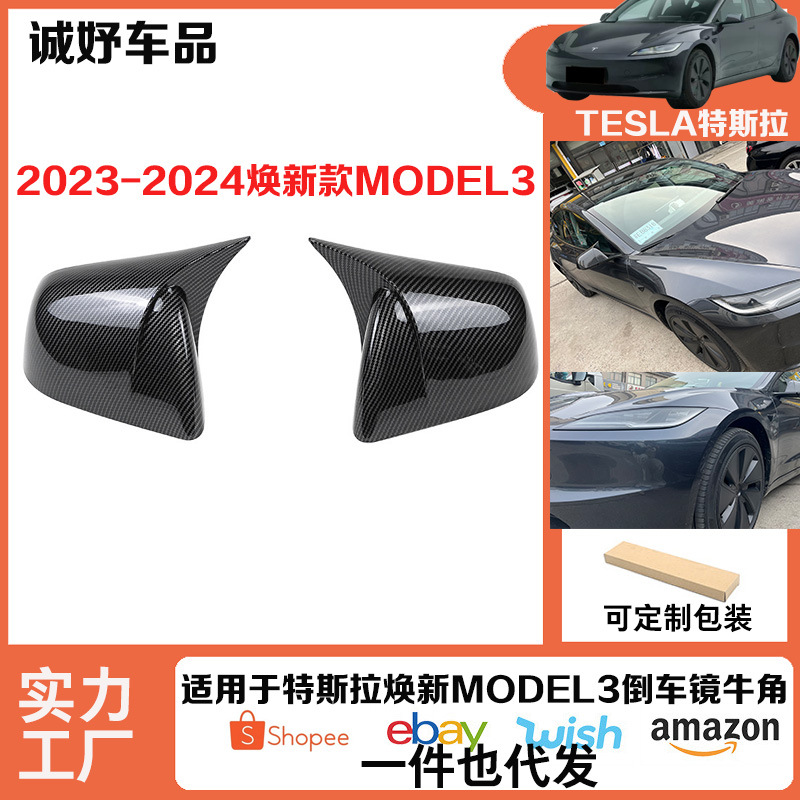 Cocok untuk Huanxin Tesla MODEL 3 tanduk penutup kaca spion modifikasi mobil hitam terang/dimensi penyambungan karbon