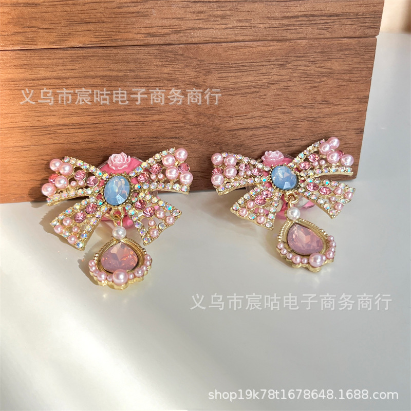 Aksesoris liontin rantai ponsel manik-manik melalui lubang, industri berat diy busur merah muda biru penuh berlian geser manik-manik tanah liat