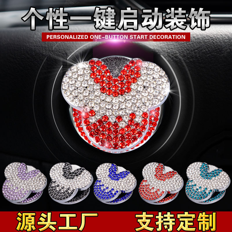 Mickey penutup pelindung mulai satu klik, stiker pelindung mobil cincin dekoratif sakelar pengapian tombol kristal berlian buatan