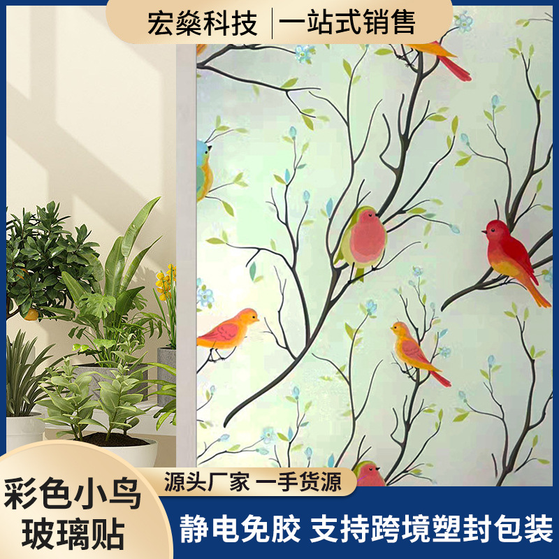 Stiker jendela kaca bebas lem statis transparan buram, film isolasi burung warna-warni tahan intip privasi