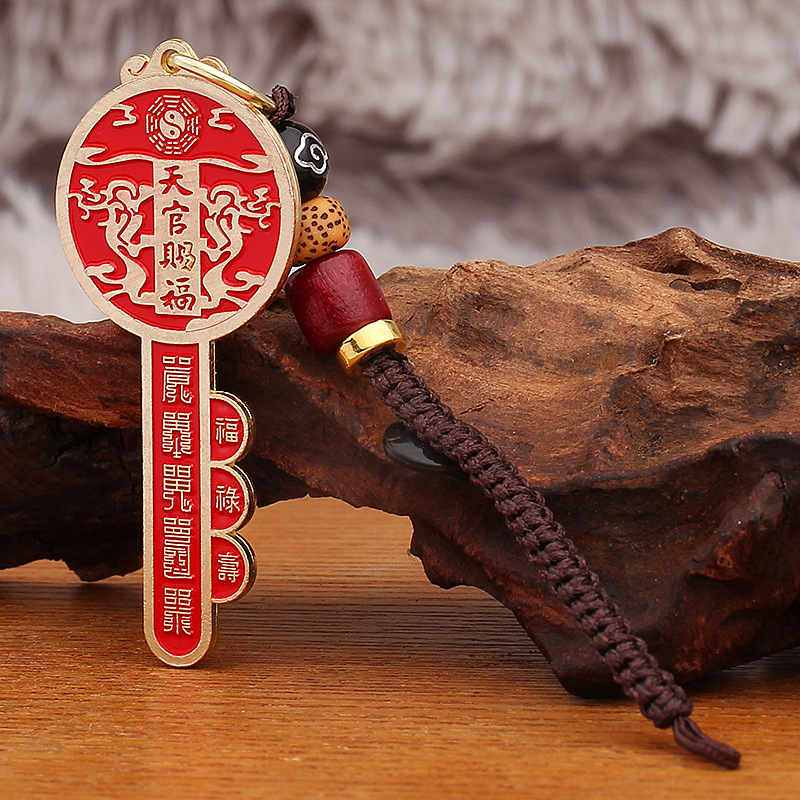 新款红油天官赐福钥匙挂件合金吊坠手工编织绳汽车钥匙扣金属批发
