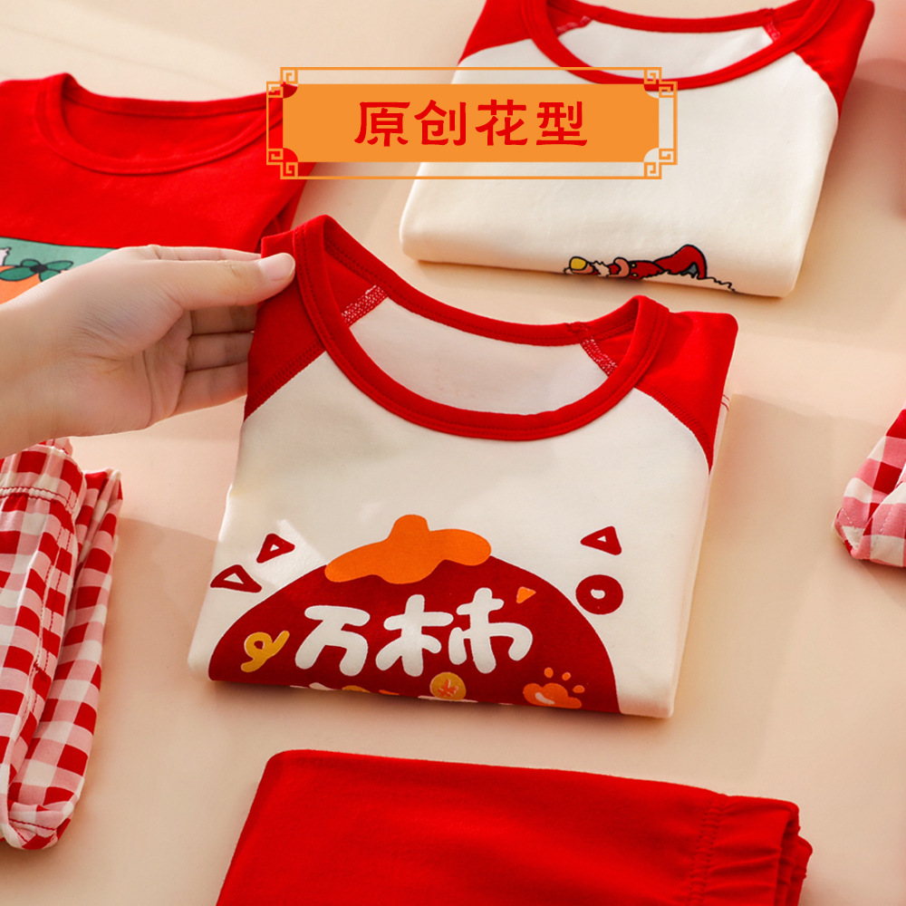 儿童套装秋衣秋裤内衣纯棉红色本命年女童男童大红新年款家居服