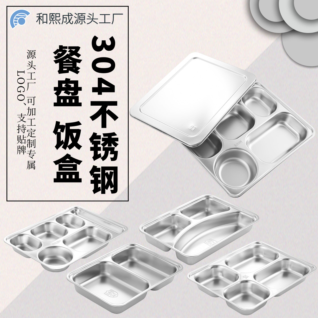 Piring makan stainless steel anak-anak, kotak makan siang pelajar tebal tebal persegi 304 dengan tutup kompartemen peralatan makan kotak makan siang piring makan malam