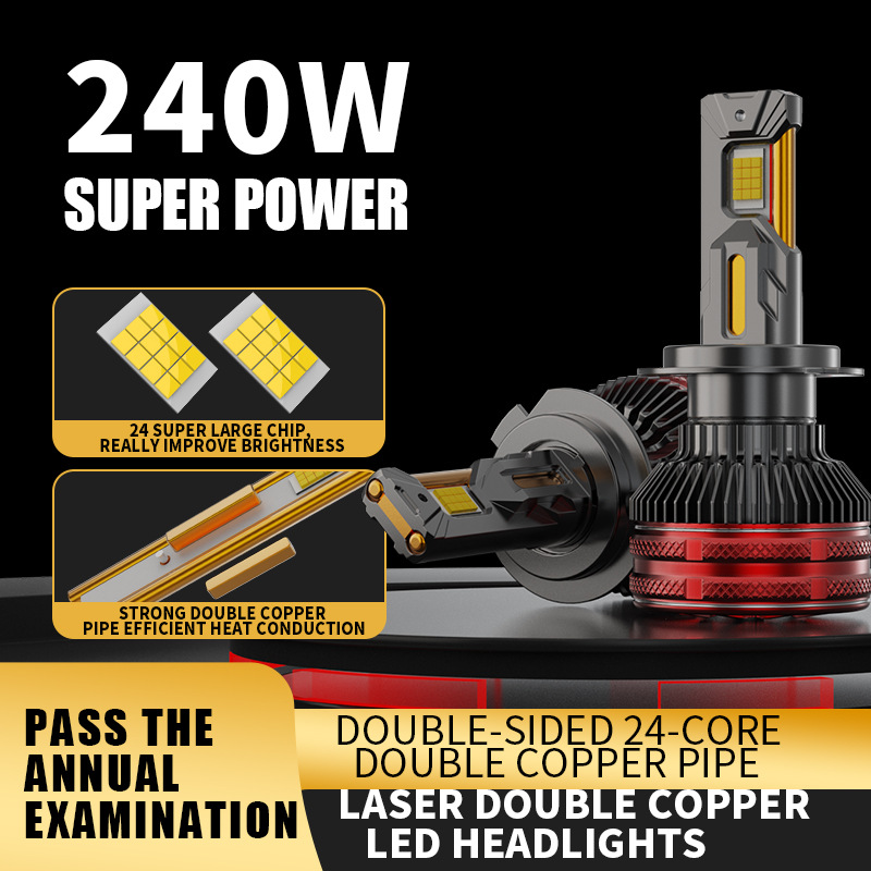 Lampu Depan Mobil LED Pipa Empat Tembaga Lintas Batas 240W Daya Tinggi H11 H7 H4 9005 Lampu Depan Jauh dan Dekat