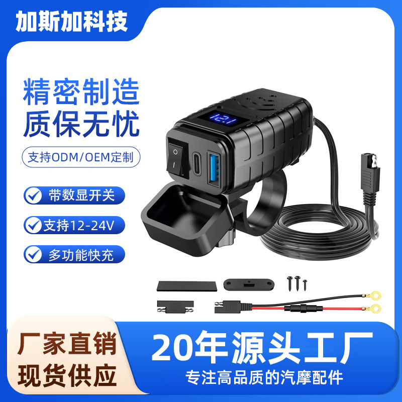 Konektor SAE baru konversi sepeda motor USB ganda dengan tampilan digital tegangan QC + PD dengan saklar pengisi daya ponsel luar ruangan