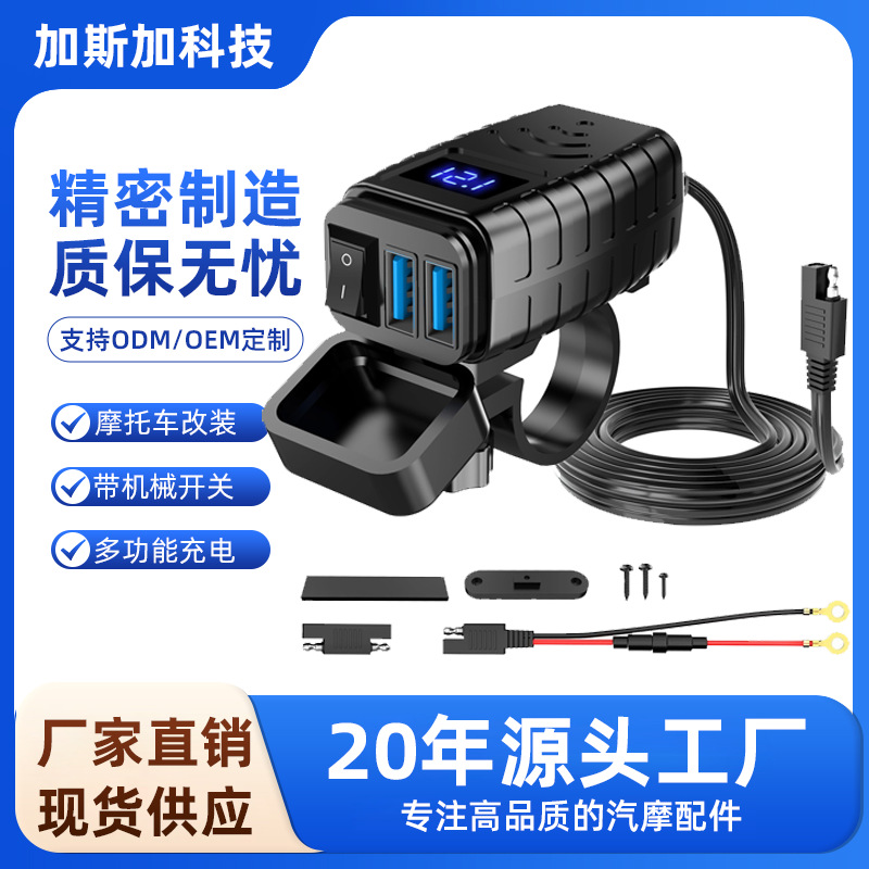 SAE konektor konversi siku sepeda motor dual USB dengan voltase tampilan digital ganda QC3.0 dengan braket tetap