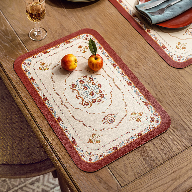 Alas makanan Barat meriah tahan air bunga merah liburan elegan Retro tatakan kulit pernikahan alas mangkuk meja makan multifungsi rumah