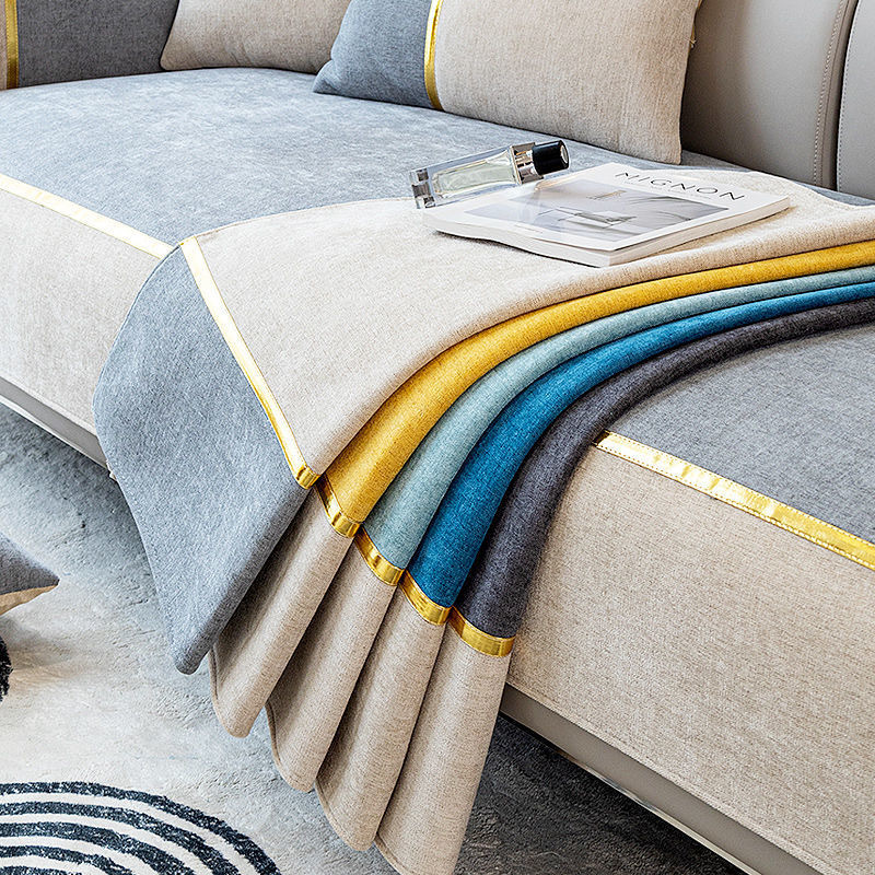 Bantalan sofa universal empat musim Nordic, bantal sofa warna solid jahitan modern sederhana anti selip mewah tepi emas
