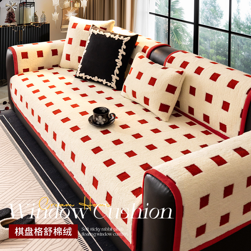 Alas Sofa Kulit Lurus Warna Merah Tahun Baru Alas Duduk Beludru Meriah Ditambah Tebal Musim Dingin Penutup Sofa Tetap Anti Licin Kain Penutup