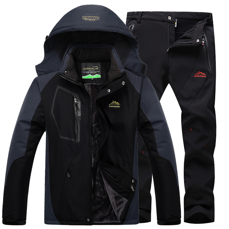 Amazon jaket olahraga luar ruangan pria, bulu berjajar tebal hangat dua potong set musim gugur dan musim dingin setelan ski
