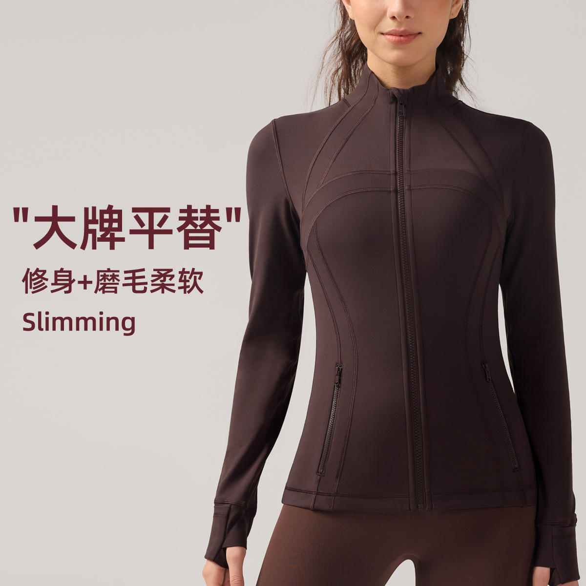 Atasan olahraga wanita lulu yoga wear, kerah berdiri, ritsleting, lengan panjang, bahan brushed elastis slim fit warna nude.