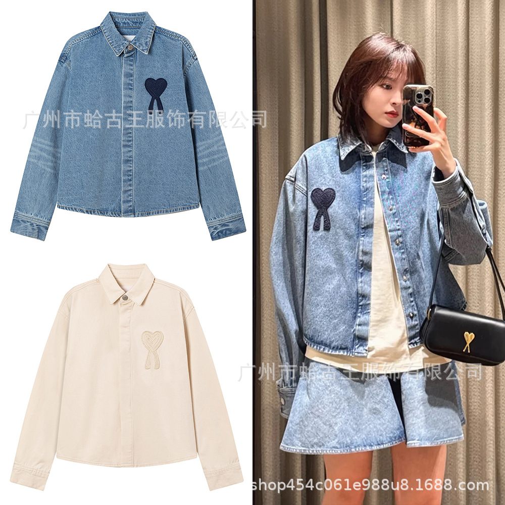 AMI CLAMS Jaket Denim Bordir Gaya Cinta Model Baru Musim Semi Musim Gugur 25 Jaket Atasan Kasual Longgar Model Pendek Pria Wanita