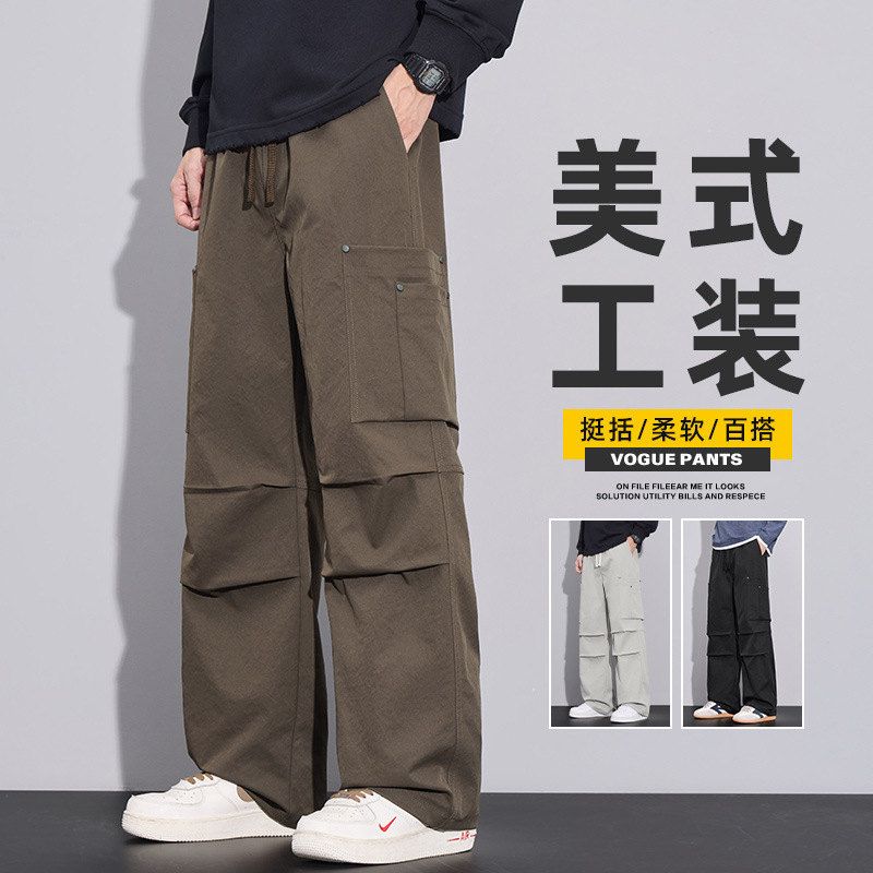 日常休闲通勤工装裤男款秋季新款宽松褶皱设计潮牌美式户外伞兵裤