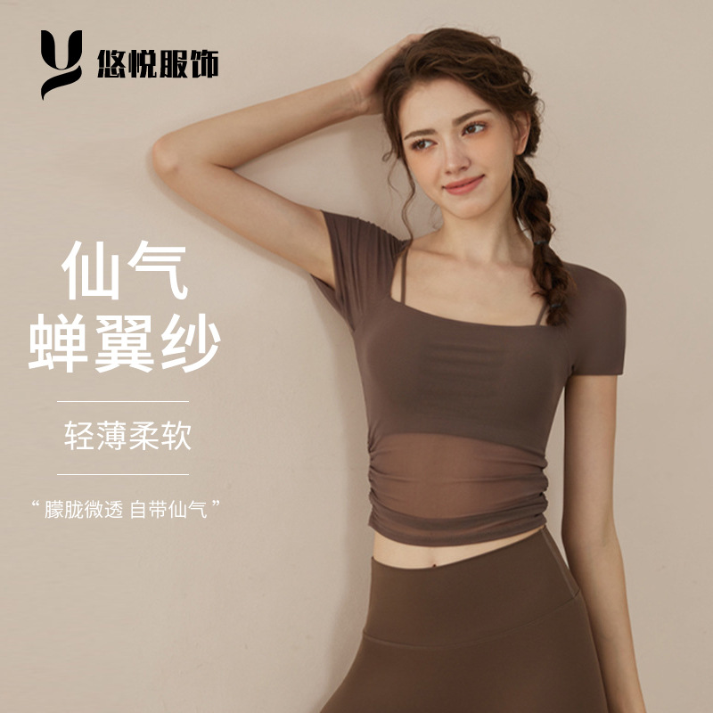 Olahraga Lengan Pendek Wanita Musim Panas Model Baru dengan Bantalan Dada Pakaian Latihan Olahraga Lari Pilates Pakaian Yoga Olahraga Kebugaran