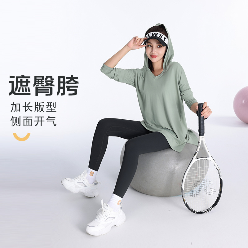 秋冬开叉连帽瑜伽长袖显瘦裸感户外运动上衣跑步健身服女透气速干