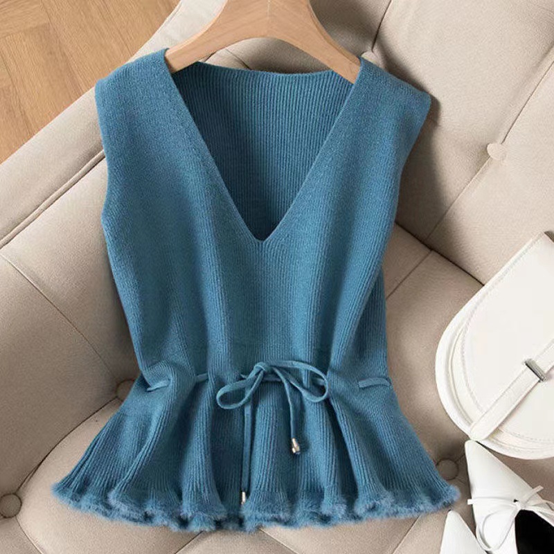 Rompi Rajutan Model Pendek Pelangsing Pinggang Kerah V Tank-top Wanita Model Baru Musim Semi dan Musim Gugur Sweater Warna Polos Tanpa Lengan Rompi Trendi