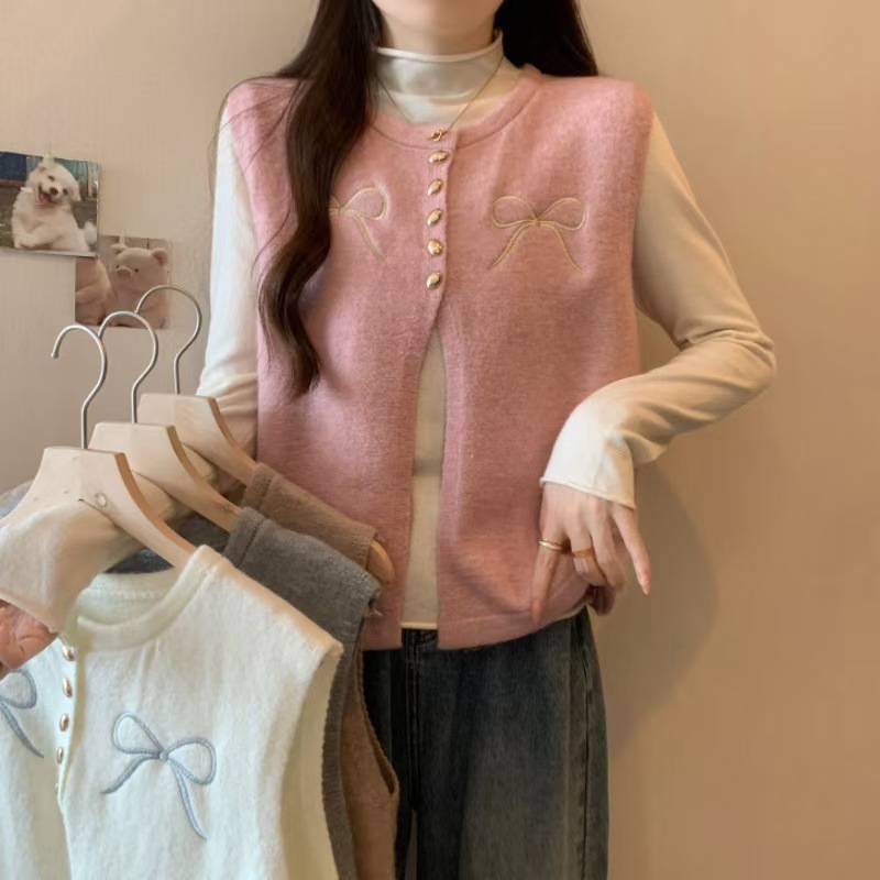 小香风蝴蝶结刺绣灰色毛衣马甲女春秋季叠穿无袖针织坎肩马夹上衣