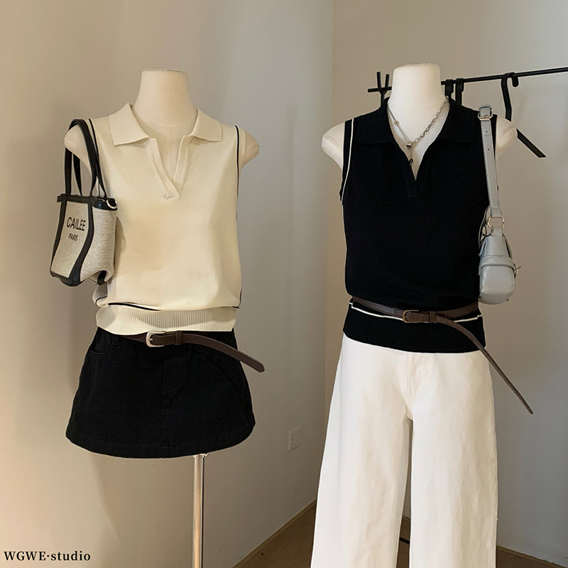 WGWE6153 Rompi Tali Kerah V Rajutan Tanpa Lengan Warna Kontras Garis-Garis Model Prancis Rompi Kerah Bahu Membentuk Badan Terlihat Langsing