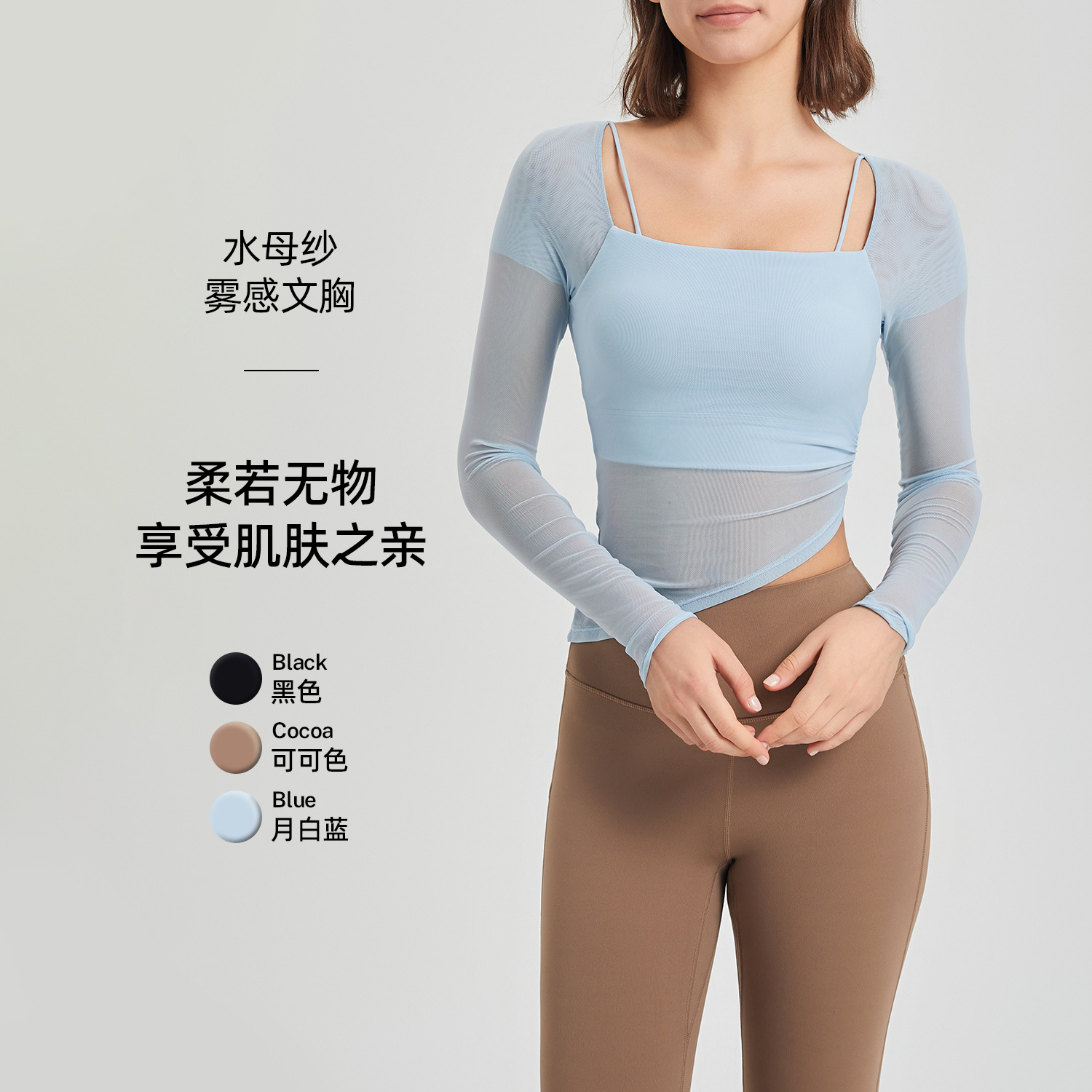 Pakaian dalam olahraga wanita, pakaian luar jala dua potong palsu dengan bantalan dada, atasan lengan panjang musim gugur