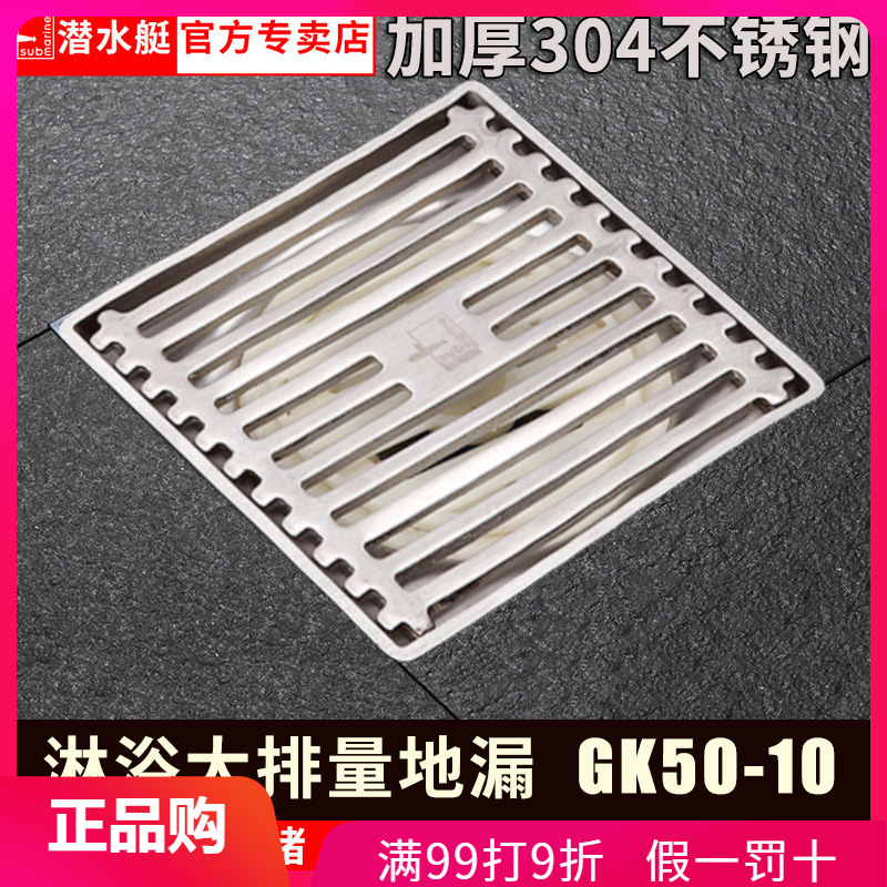 Saluran air kamar mandi, GK50-10 saluran air lantai kapal selam dipertebal 304 stainless steel, pembuangan bau lantai, perpindahan besar anti-pemblokiran