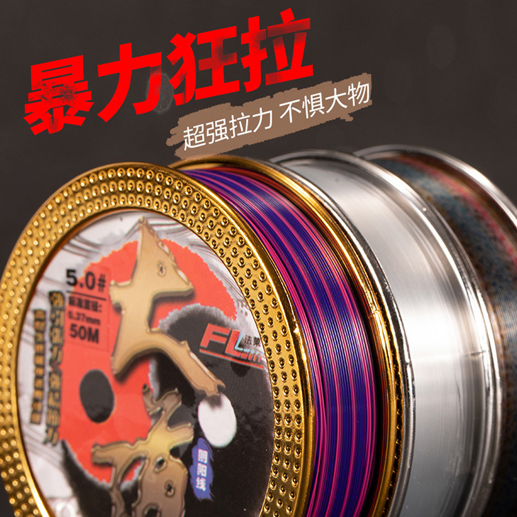 Senar pancing Falai 50 m, senar pancing tekanan kuat, senar utama sub-line, senar pancing nilon sutra mentah dua warna, senar pancing kompetitif lembut