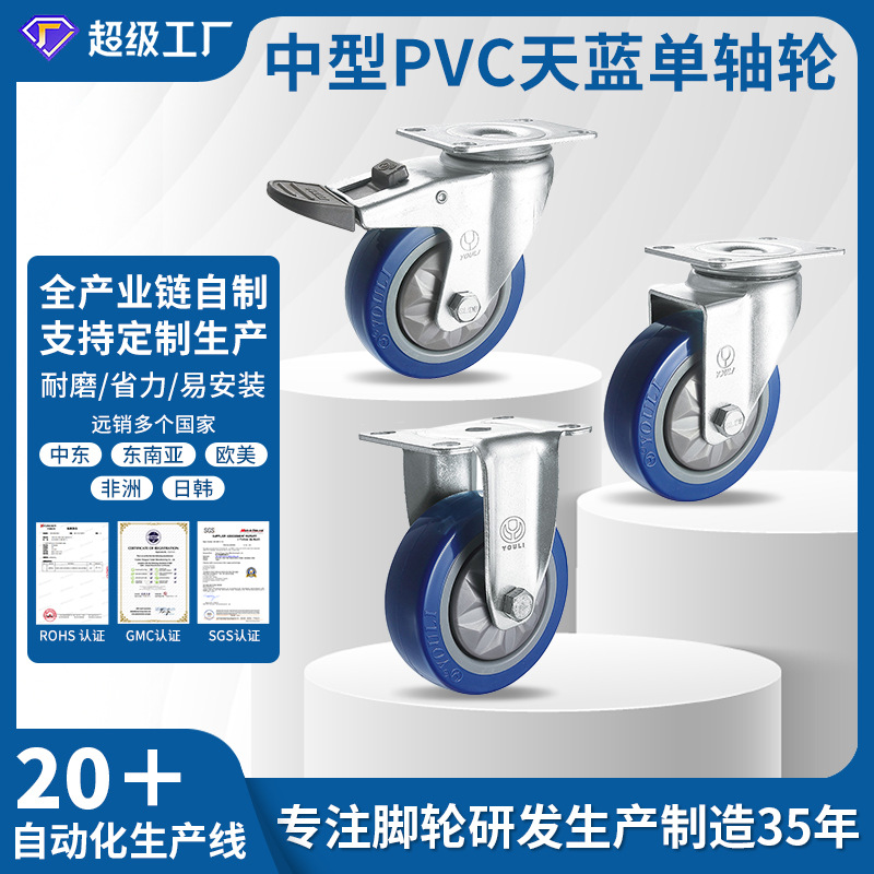 Medium PVC biru langit roda tunggal sumbu troli universal peredam makan tahan aus kastor industri skuter datar