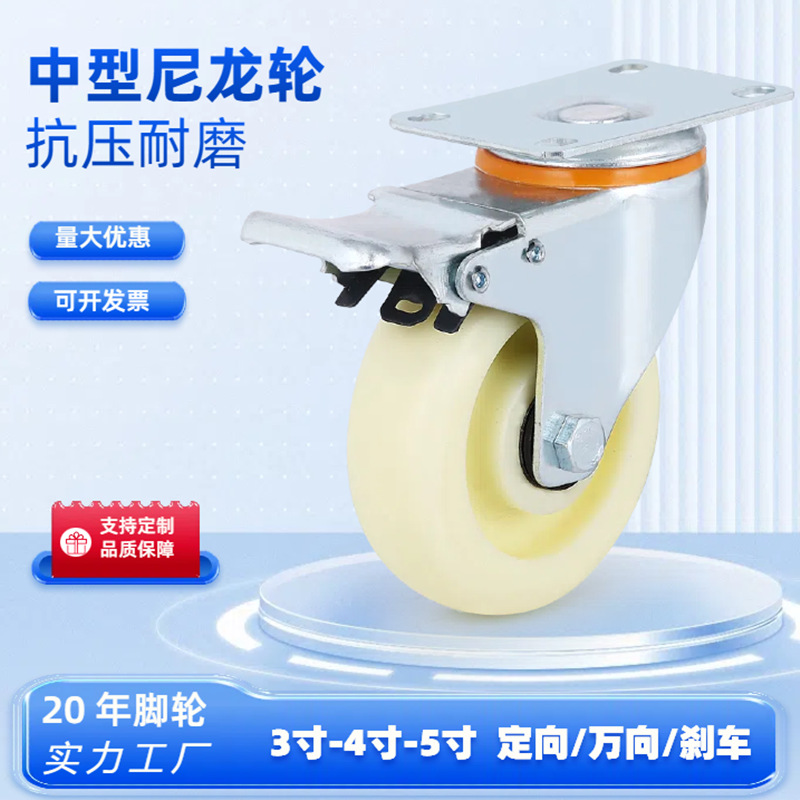 Roda Universal Sedang 345 Inci Kastor Diam Ringan Directional Rem Velg Troli Industri Nilon Putih