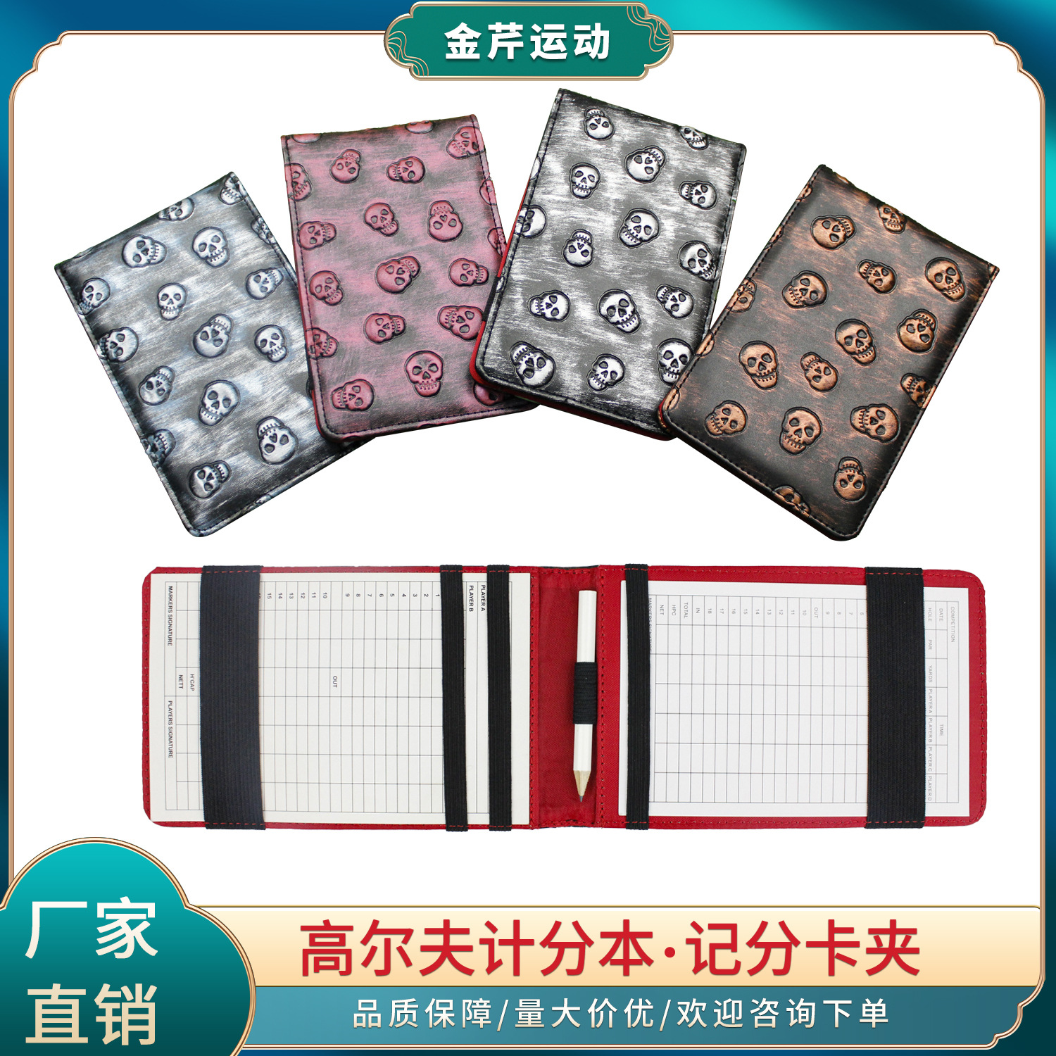 Penjualan terlaris lintas batas buku Skor golf pola tengkorak poin kompetisi buku perekam kulit PU klip skor golf