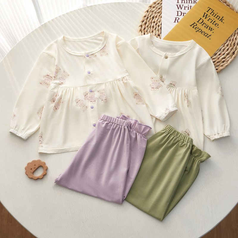 Baju tidur anak laki-laki dan perempuan, baju tidur bayi kartun lengan panjang AC musim panas Chengbao