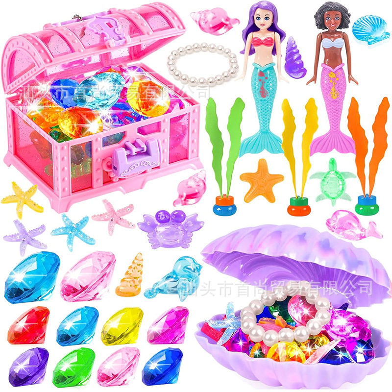 Cross-Border Hot Jual Mainan Menyelam Anak-anak Musim Panas Glow Glow Jewel Treasure Box Kolam Renang Putri Duyung Set Latihan Bermain Air