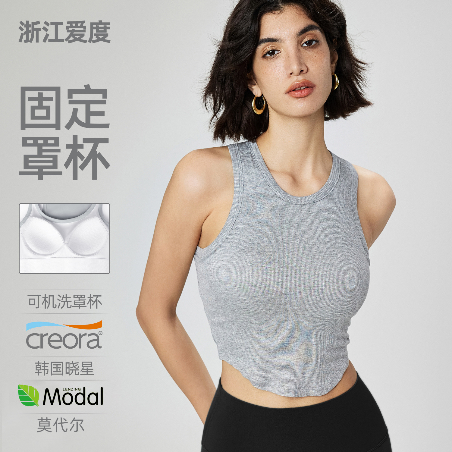 莫代尔罗纹裸感瑜伽背心女夏季短款健身内衣圆领半固定运动文胸夏