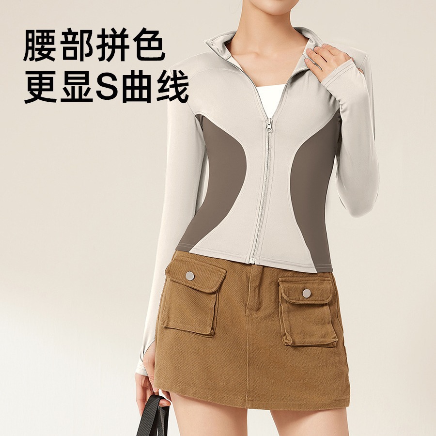 Pakaian Yoga Terlihat Langsing Slim Fit Kerah Tegak Warna Kombinasi Persik Model Baru Jaket Pakaian Bersepeda Lari Bernapas Elastis Tinggi Wanita