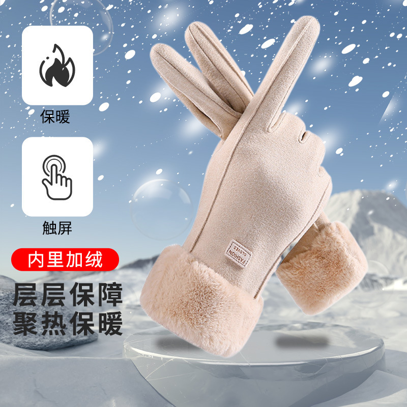 爱心刺绣冬季新款保暖手套女士加厚加绒防寒骑行触屏手套长绒滑雪