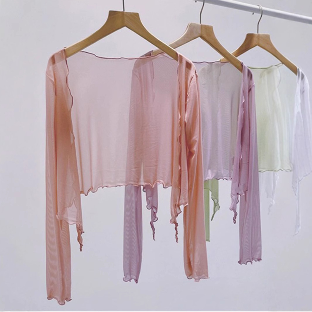 Kardigan Wanita Model Tipis Jaring Kecil Bahu Tipis Musim Panas dengan Tali Selempang Selempang Renda Baju Selubung Sifon Baju Tari