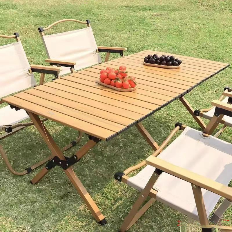 Meja Lipat Berkemah Luar Ruangan Set Meja Makan dan Kursi Piknik Jala Besi Gulungan Telur Kayu Solid Portabel Meja Jaring Anti Panas Sederhana