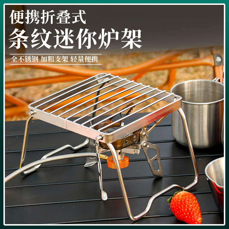 Rak kompor lipat untuk berkemah, rak panggang kompor portabel piknik bahan baja tahan karat, rak kompor lipat motif garis-garis mini