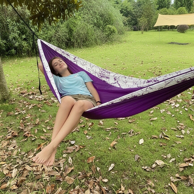 Hammock satu orang siap kirim, bahan parasut nilon lebar, untuk berkemah dan tidur di luar ruangan