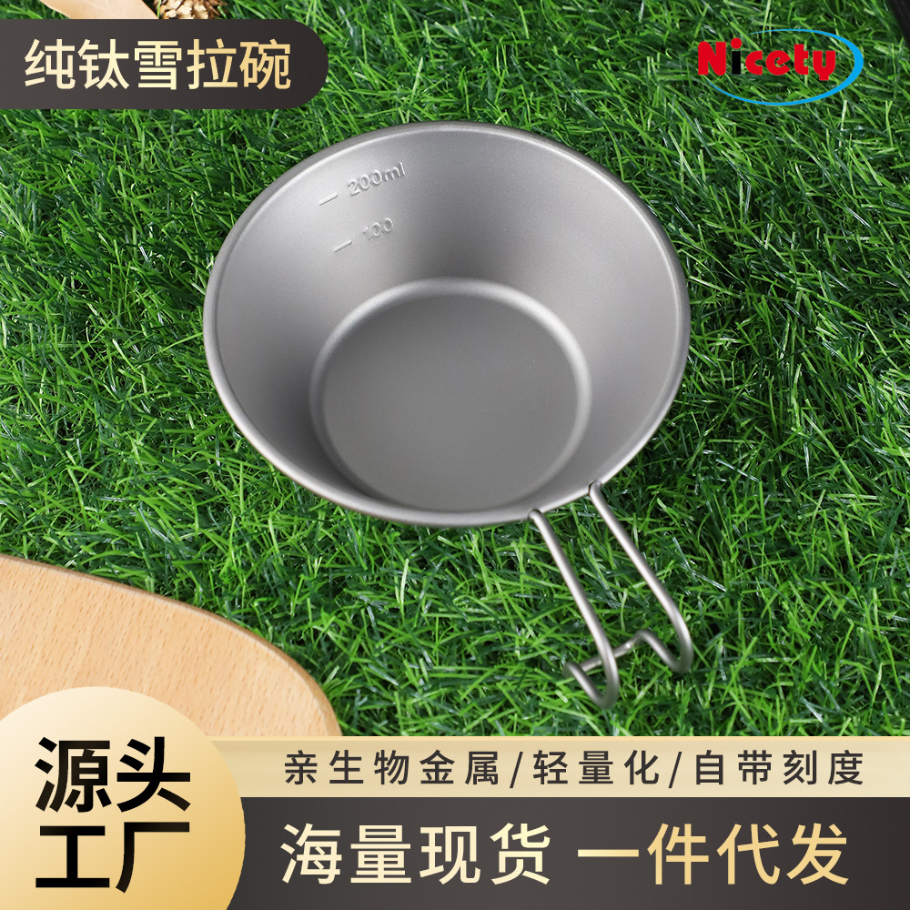 Mangkuk salad titanium murni luar ruangan, peralatan masak berkemah dengan skala portabel paduan titanium, peralatan makan dapat digantung cangkir salad berkemah